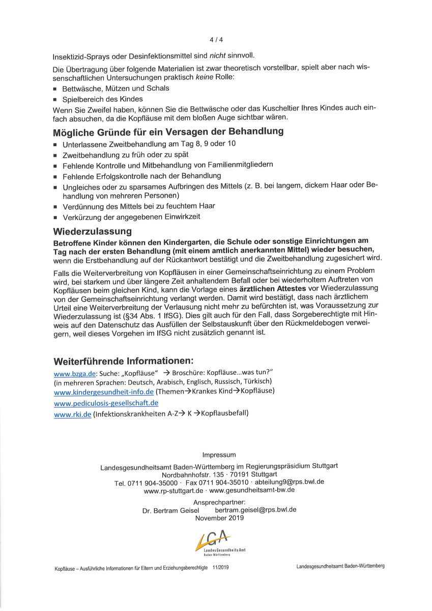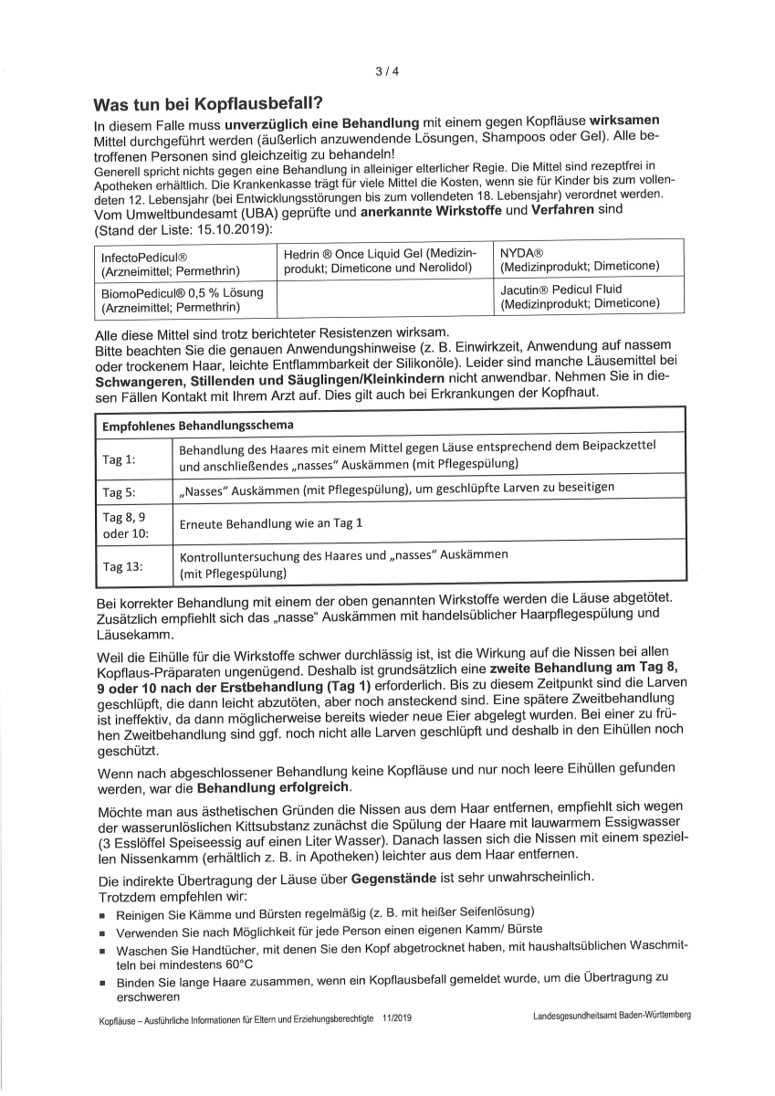 Bitte untersuchen sie die Haare ihres Kindes und geben uns Bescheid, sobald ein Kopflausbefall festgestellt wurde, damit wir die Parasiten wieder aus der Schule ausquartieren können!