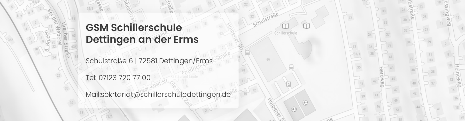 Die Schillerschule in Dettingen/Erms ist seit dem Schuljahr 2013/14 eine Gemeinschaftsschule, die aus der Primarstufe und der Sekundarstufe I besteht. In der Primarstufe werden die Schülerinnen und Schüler nach dem Bildungsplan der Grundschule unterrichtet. Sie endet somit nach Klasse 4. Für die Schülerinnen und Schüler der Primarstufe ist über verschiedene Module eine Ganztagesbetreuung von maximal 7-17 Uhr mit Mittagessen und Hausaufgaben möglich. Zusätzlich bieten wir in der unterrichtsfreien Zeit eine Ferienbetreuung an.